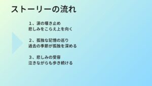 物語は、涙をこらえるための「涙の堰き止め」から始まります。しかし、上を向くことで視界に入る夜空は、過去の幸せな記憶を呼び覚まし、「孤独な記憶の巡り」へと主人公を誘います。そして、こらえきれなくなった感情と向き合った末に、涙を流しながらも歩き続けるという「悲しみの受容」の境地へとたどり着くのです。