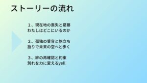 物語は、自分の現在地を見失い、不安に苛まれる「わたし」の独白から始まります(現在地の喪失と葛藤)。しかし、その葛藤は「僕ら」という仲間たち共通の課題へと昇華され、彼らはあたたかい場所から離れ、それぞれの夢に向かって歩き出すことを決意します(孤独の受容と旅立ち)。そして、別れは終わりではなく、互いを未来へと繋ぐエールなのだと気づき、仲間との永遠の絆を胸に、独りで立つ強さを見出すのです(絆の再確認と約束)。