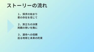この物語は、世界のどこかにいるはずの「君」の存在を確信する「探求の始まり」から幕を開けます。そして、両親から受け継いだものを心の支えとし、旅立つ「旅立ちの決意」を固めます。最後には、自分たちを隔てながらも、いつか巡り合わせてくれるであろう世界そのものへの「運命への信頼」を歌い上げ、未来での再会を確信するのです。