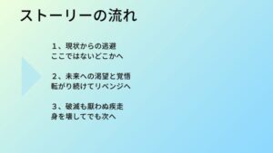 まず、物語は「現状からの逃避」から始まります。主人公は今いる場所ではない「新しい街」を目指し、衝動的にタクシーに乗り込みます。そして、その道中で未来への強い「渇望と覚悟」を固めていきます。失敗を恐れず、転がり続けることこそが自分の生き方だと確認するのです。しかし、その思いは次第にエスカレートし、最後には自己破壊すらも厭わない「破滅も厭わぬ疾走」へと変貌を遂げていきます。この一連の流れは、夢を追うことの光と闇、その両面を描き出していると言えるでしょう。